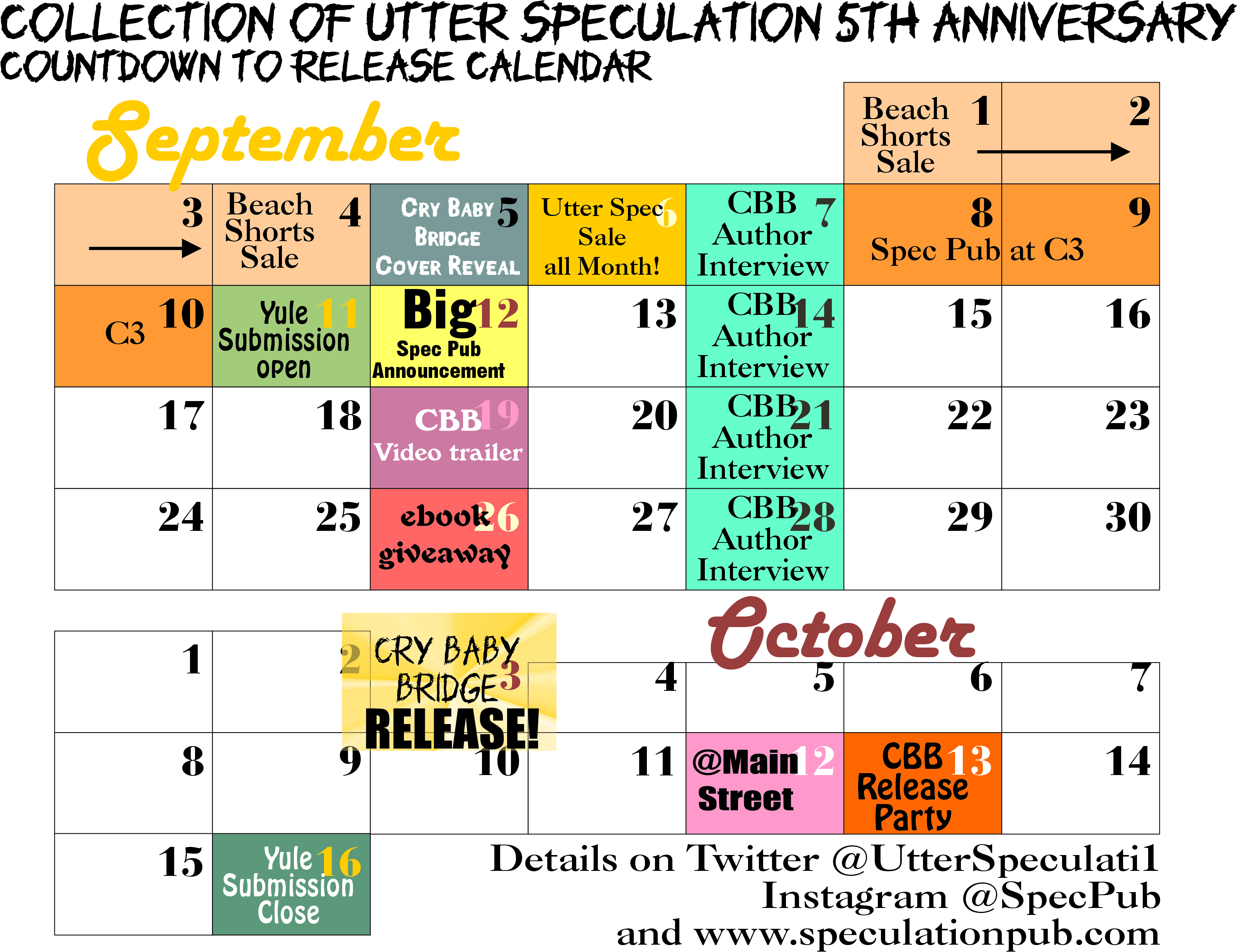 We’ll be celebrating our anniversary all through spooky season with giveaways, author interviews, and big spec pub news. Sign up for our newsletter and be eligible for any giveaways, contests and the first to find our what’s happen in the spec pub world. And check out calendar below for all the speculations this season has to offer.