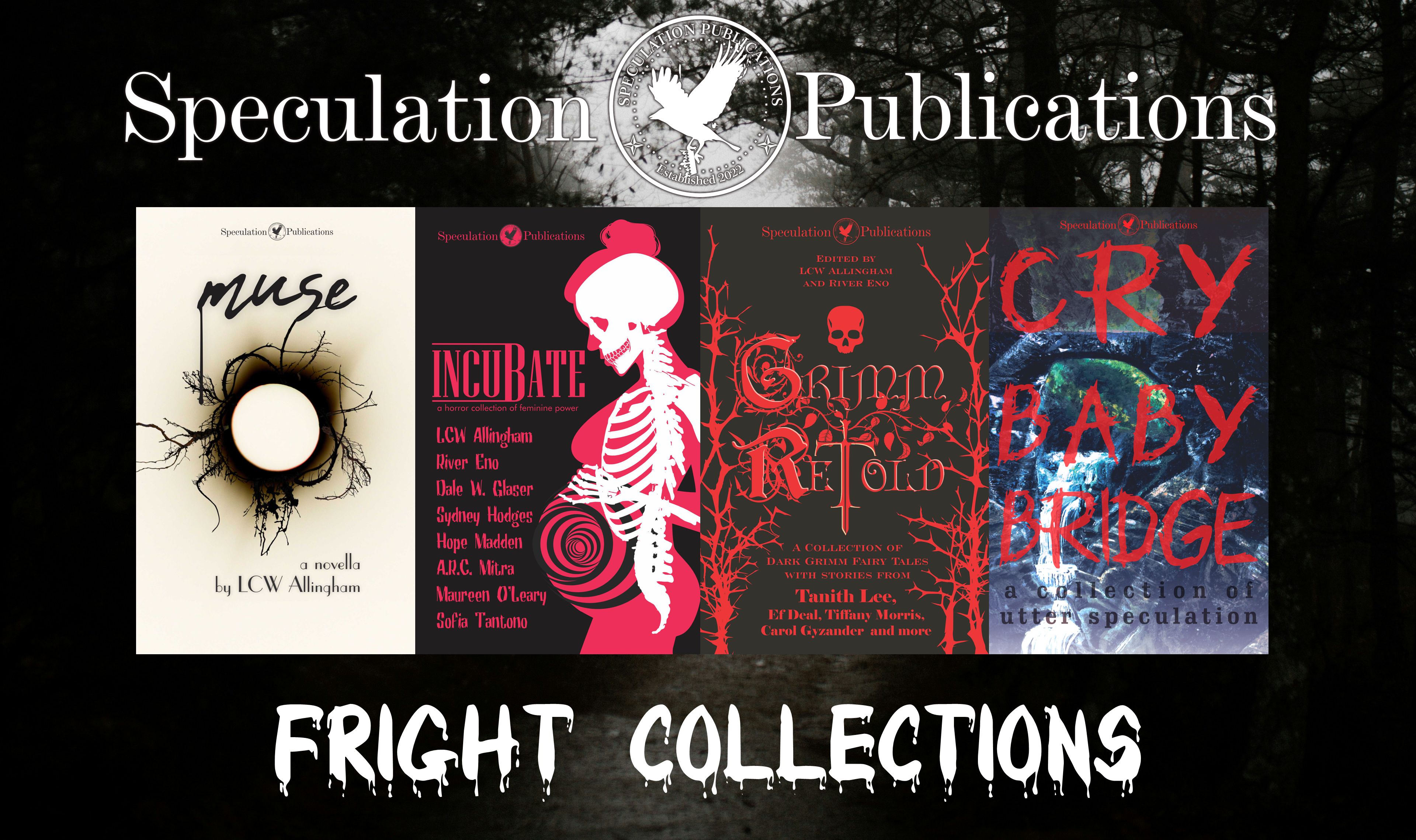 And if you have similar taste in horror to me, I would always recommend the horror anthologies published by Speculation Publications, being that I helped curate them. Incubate is our anthology of furious “Good for Her” Horror. Grimm Retold, our nightmare fairy tales, and Cry Baby Bridge, our dark horse of a book with truly disturbing stories of the prevalent urban legend.